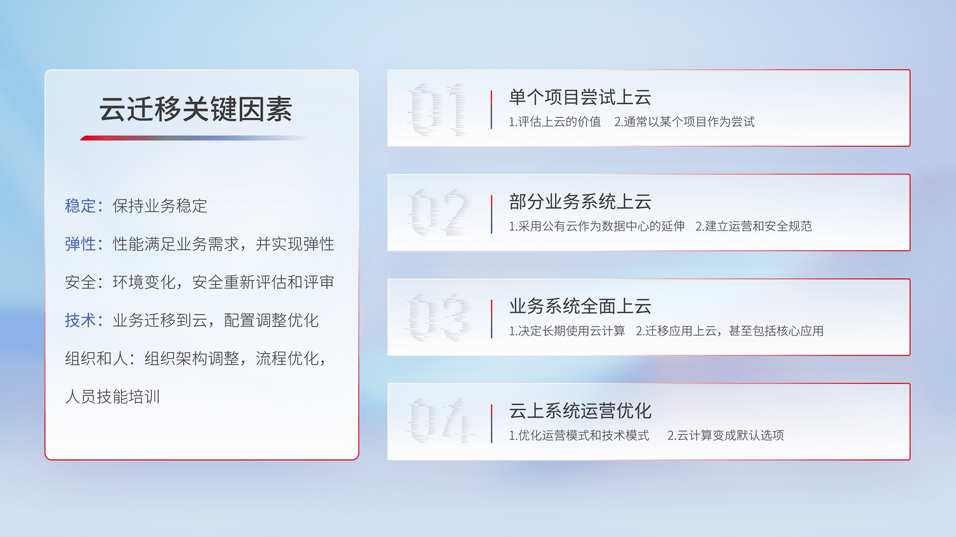 结合实际业务,,,从规划设计、、、、云平台选型、、云原生改造、、数据迁移、、集成交付,,迁移全过程为客户识别最佳上云路径,,,做好风险识别管理,,设计网络架构、、身份权限、、安全审计合规、、、操作审计、、、日志审计、、、监控告警策略、、、、多站点容灾设计等,,,对云上基础设施进行整体规划,,提升IT治理水平,,,,以满足弹性、、、、高可用、、、、高性能的需求。。。